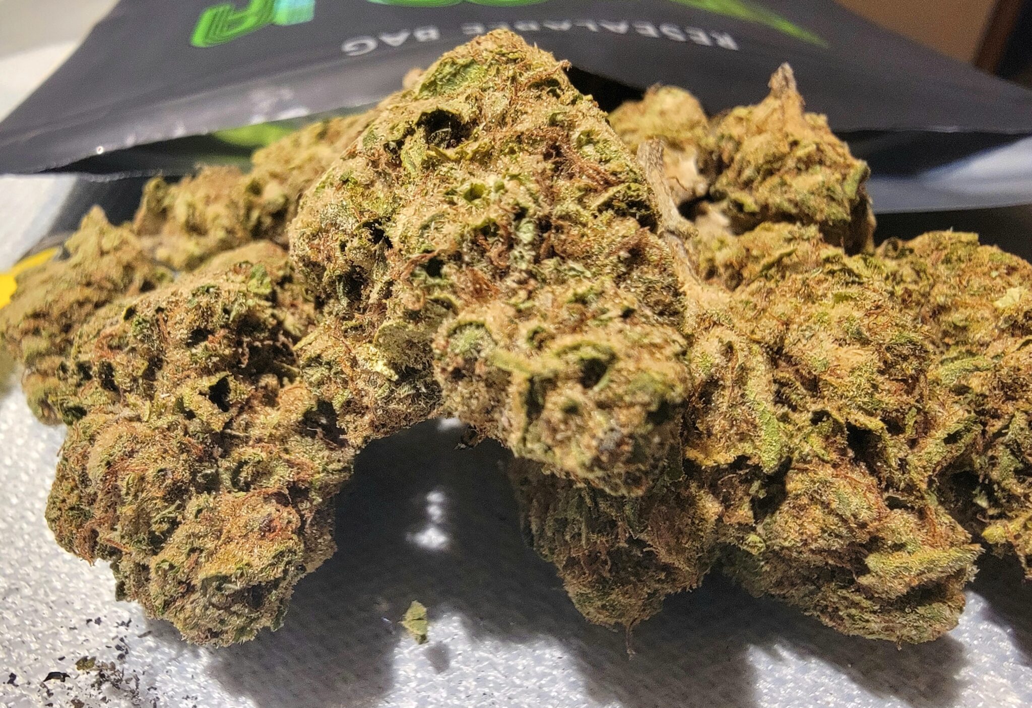 First part is the medical review, the second part will be the recreational review when I open the bag I was very surprised big huge buds awesome smell but would impress me the most was the texture they were dense buds but it had a soft spongy feeling to it that’s always a sign of high quality flower from my 45 years of smoking it was excellent trimming too I suffer from multi-level disc degeneration in the c4 5 and 6 also have it in my right hip I have post traumatic stress disorder racing thoughts and sleepless nights after taking four puffs I was finally able to sit and watch a whole movie and concentrate just on the movie My pain went from a 7 to a 3 halfway through the movie I took two more puffs an hour later hit the bed and slept like a rock for once if you need an extra boost for an anti-inflammatory I highly recommend Dr g’s CBD and mix it in with a little bit of the THCA flower works wonders now as a recreational user I can honestly tell you this stuff is fire