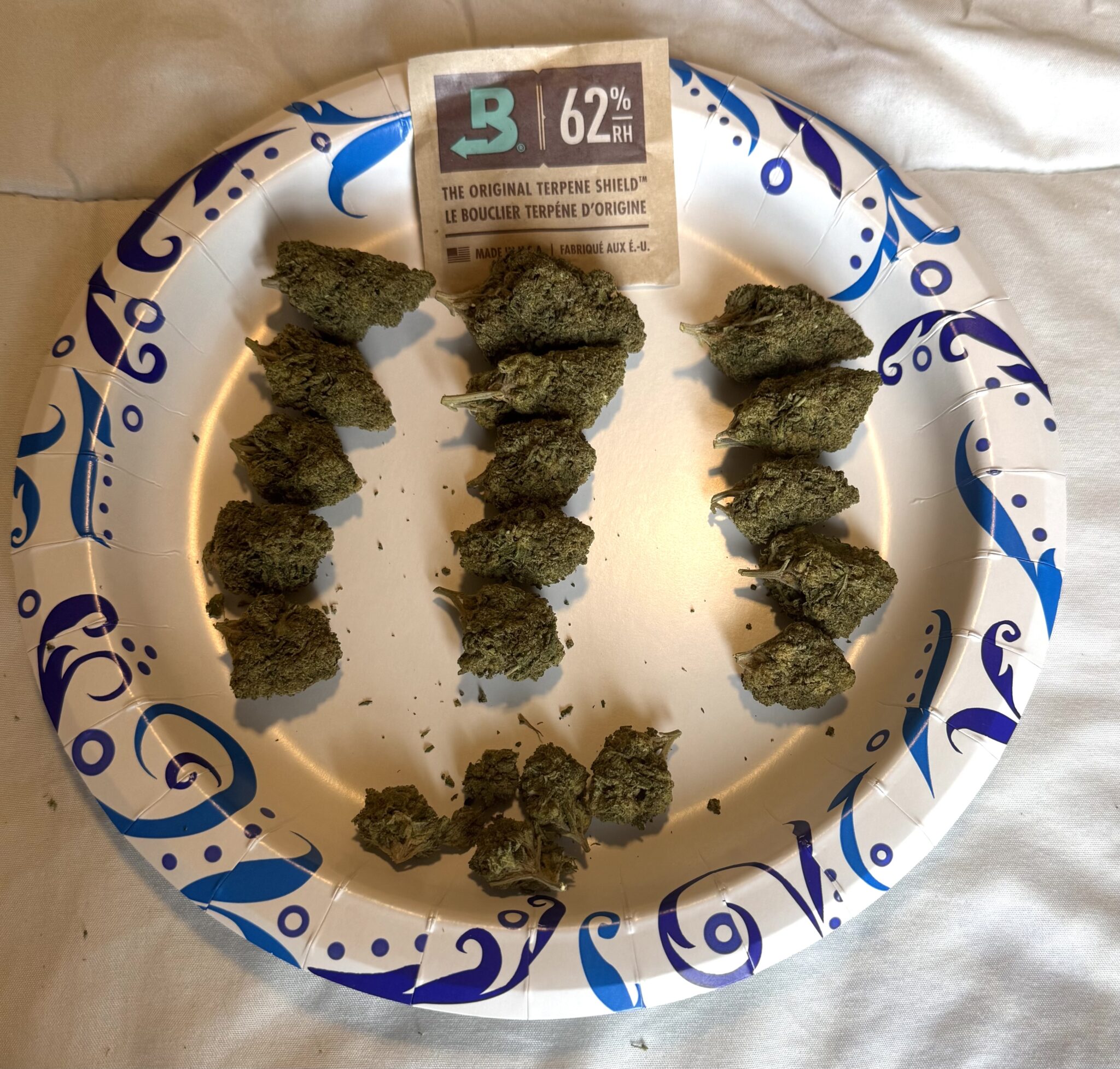 Ok this is an indica (29% Thca). It has a very dynamic earthy sent that is darker with different notes. I cannot put into words the smell is nice it’s not pine but something of the sort and I am happy with the bud size that I got! Also this included a Bolivia 62% pack! That keeps humidity in check. These are dense tough buds! They are also unbelievably sticky this bud likes to hang out at the top of the grinder because it is that sticky my fingers practically turned green. So you gotta take the grinder apart and carefully get what is on top out without making a mess.