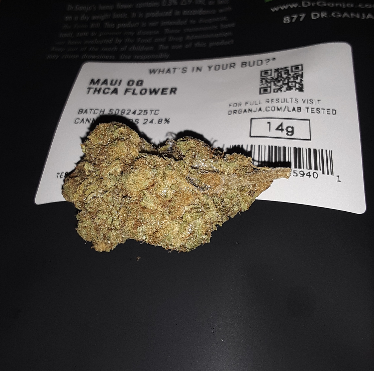 First part is the medical review, the second part will be the recreational review when I open the bag I was very surprised big huge buds awesome smell but would impress me the most was the texture they were dense buds but it had a soft spongy feeling to it that’s always a sign of high quality flower from my 45 years of smoking it was excellent trimming too I suffer from multi-level disc degeneration in the c4 5 and 6 also have it in my right hip I have post traumatic stress disorder racing thoughts and sleepless nights after taking four puffs I was finally able to sit and watch a whole movie and concentrate just on the movie My pain went from a 7 to a 3 halfway through the movie I took two more puffs an hour later hit the bed and slept like a rock for once if you need an extra boost for an anti-inflammatory I highly recommend Dr g’s CBD and mix it in with a little bit of the THCA flower works wonders now as a recreational user I can honestly tell you this stuff is fire