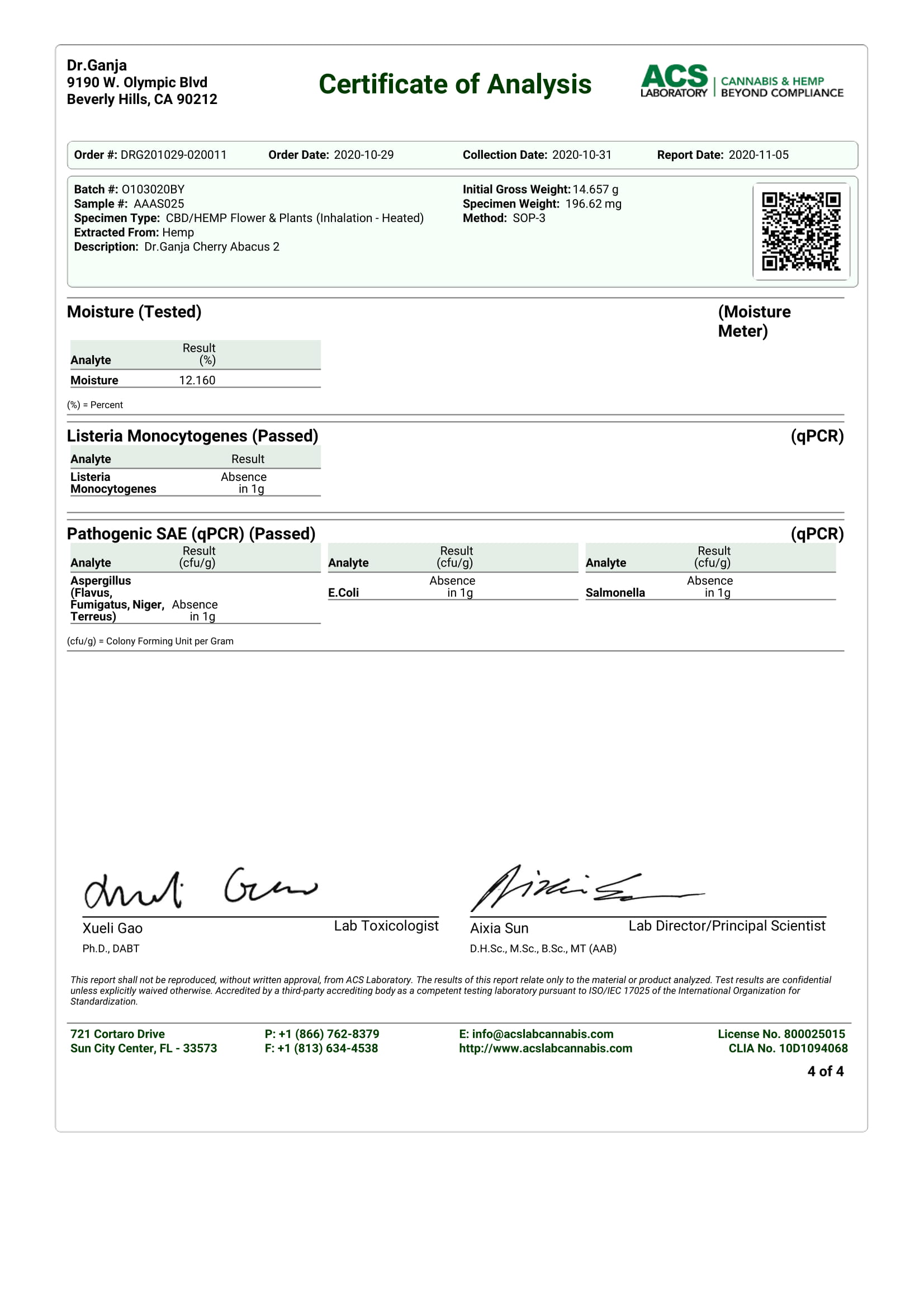 Dr.Ganja Cherry Abacus CBD flower was also tested for mycotoxins and all tests came back negative, none detected.