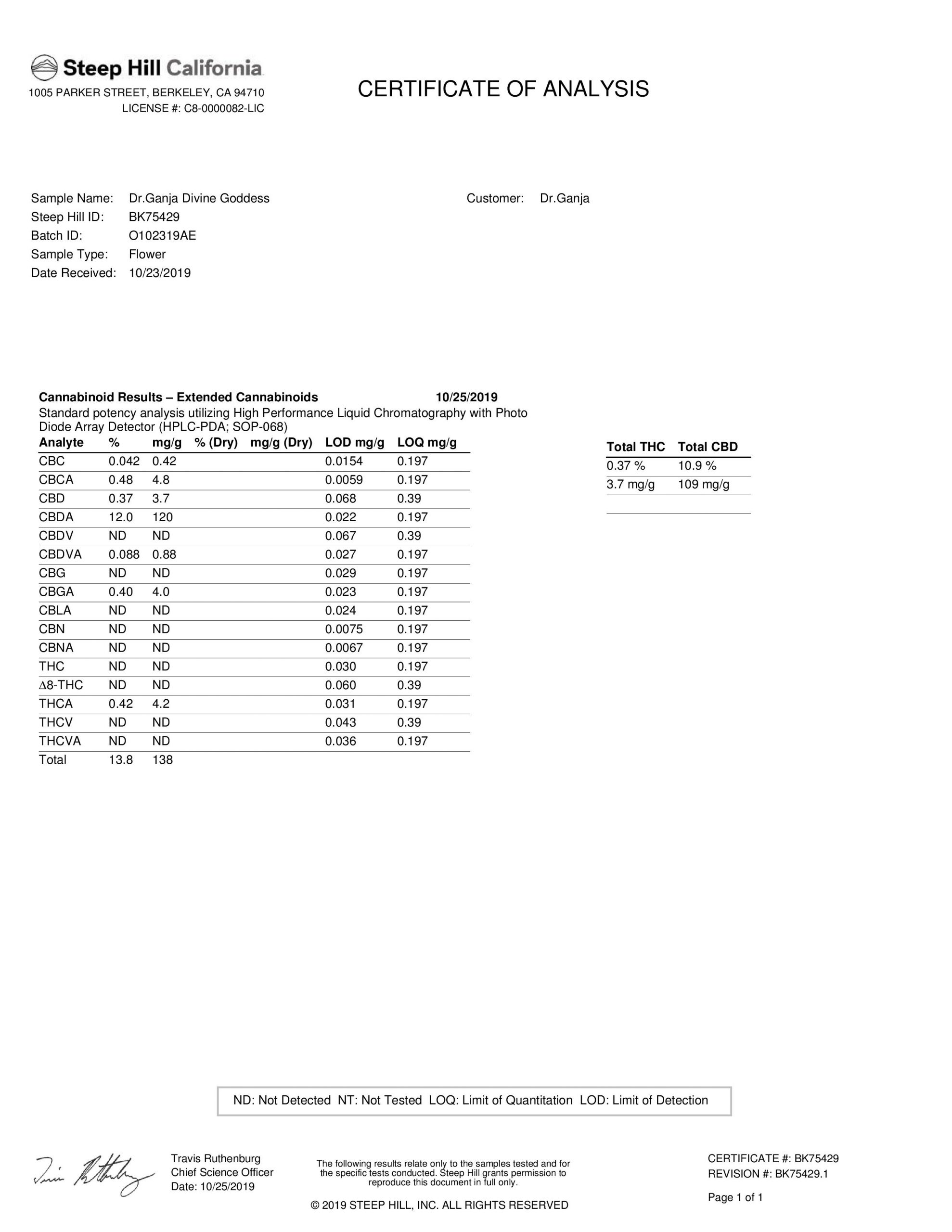 Dr.Ganja Divine Goddess CBD hemp flower is available in 1 Gram, 3.5 Gram, 7 Gram, 14 Gram and 1 ounce weight increments. It’s tested at 12% CBDA and contains less than 0.3% Delta 9 THC.