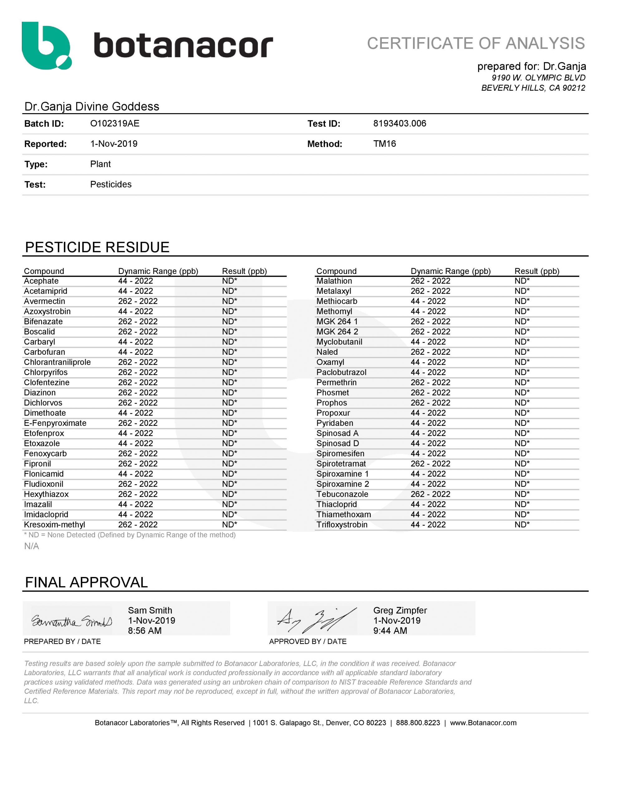 No pesticides detected. We test all of our flower at Dr.Ganja to make sure what you’re consuming is pure and safe. Check out the attached safety pesticide lab reports.