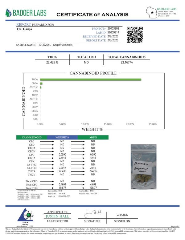 CBGA .4913%, CBG .0390%, D9-THC .2017%, THCA 22.435%. Total Cannabinoids 23.167%.