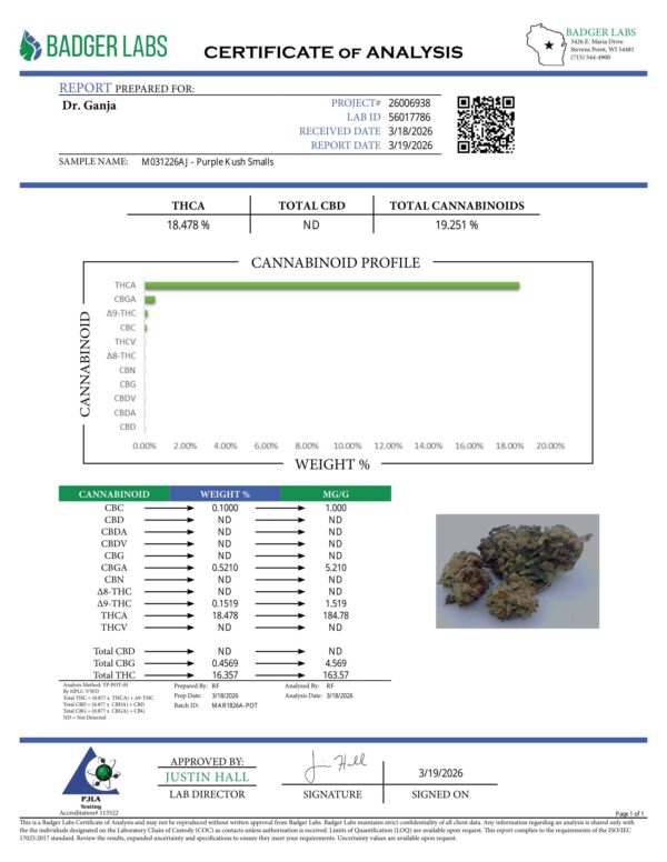 CBC .1000%, CBGA .5210%, D9-THC .1519%, THCA 18.478%. Total Cannabinoids 19.251%.