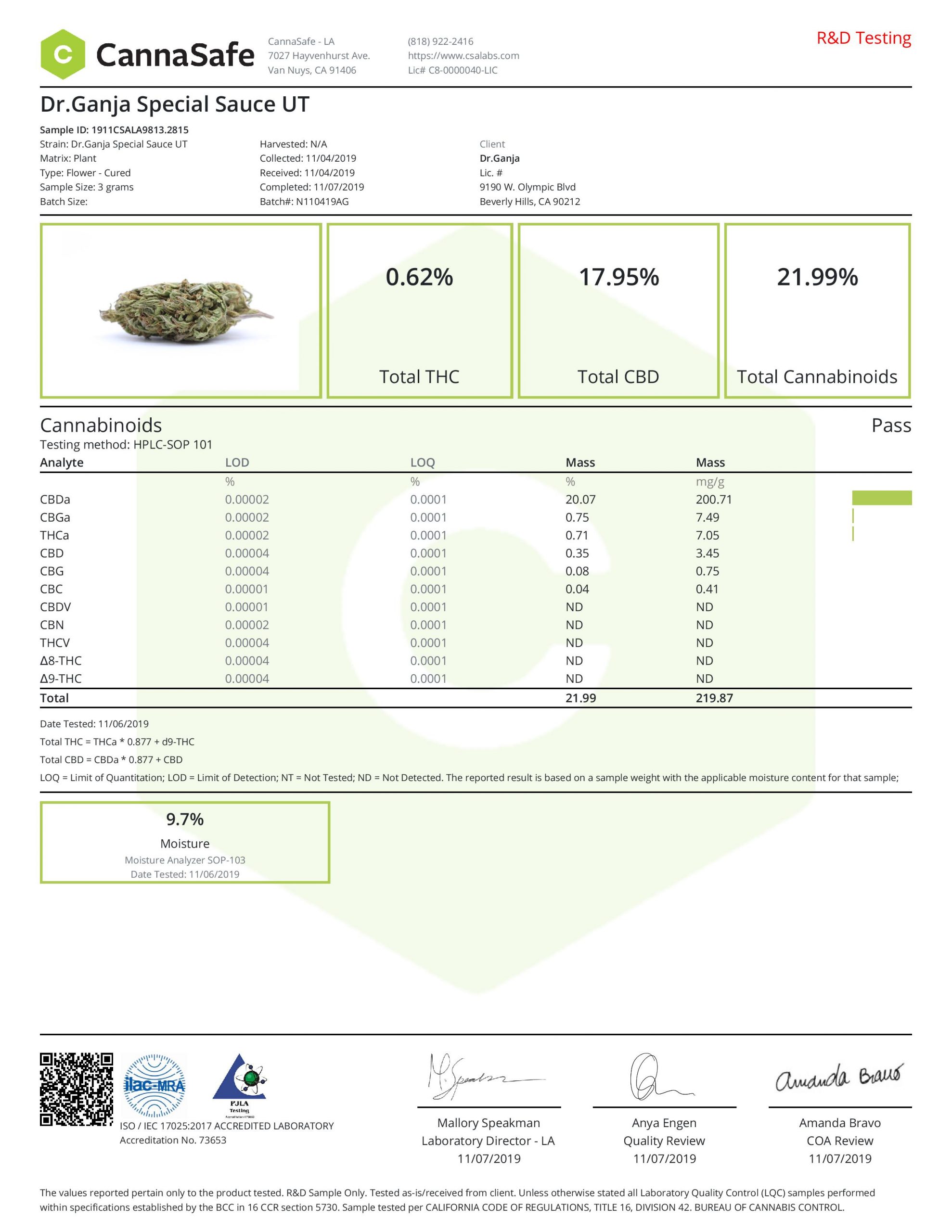 Dr.Ganja Special Sauce Untrimmed CBD Flower was tested for microbial impurities and yielded immaculate results, no microbial activity of any kind.